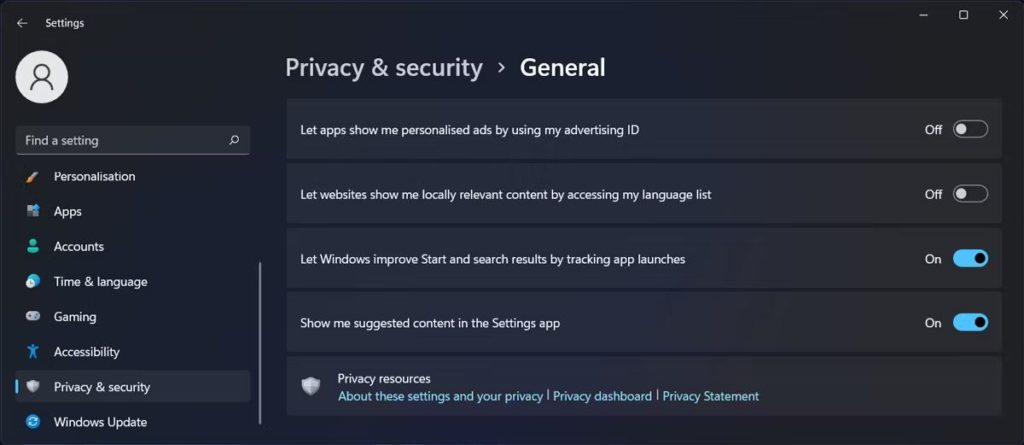 Windows 11 pone un gran énfasis en la privacidad y le brinda fácil acceso a configuraciones que le permiten administrar sus datos. Puede desactivar la función de ID de publicidad como se muestra aquí:
