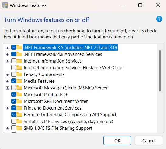 Paso 4:En el "Características de Windows” ventana, busque “Marco .NET”en la lista de funciones disponibles.