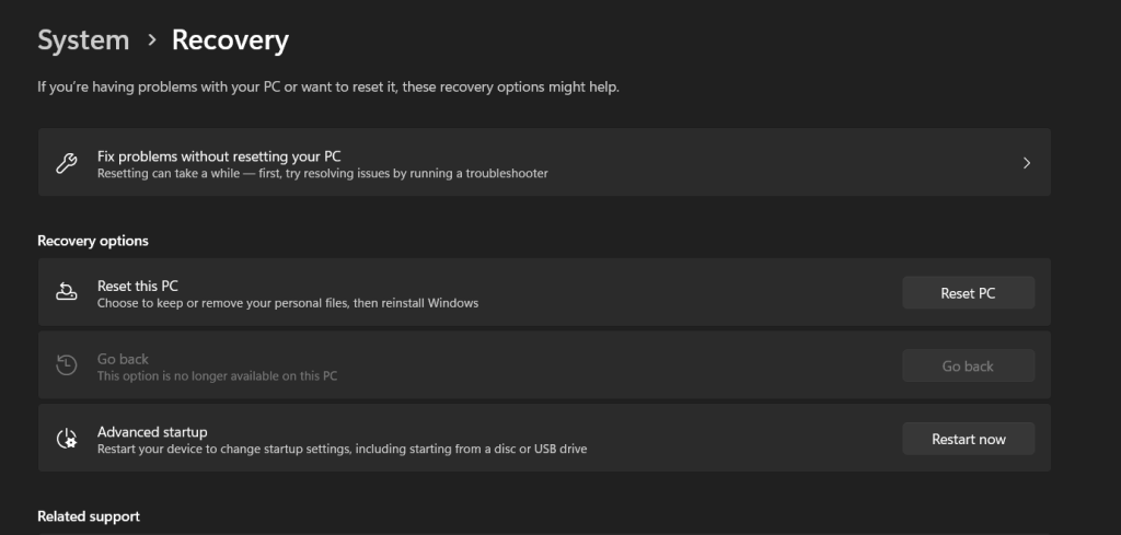 Si todas las soluciones anteriores no resuelven el error “Falta Msvcr110.dll” en Windows 11, realizar un reinicio de Windows puede ser un paso más drástico pero efectivo para restaurar su sistema a un estado funcional. Sin embargo, tenga en cuenta que este proceso eliminará las aplicaciones y configuraciones instaladas, así que asegúrese de realizar una copia de seguridad de los datos importantes antes de continuar.