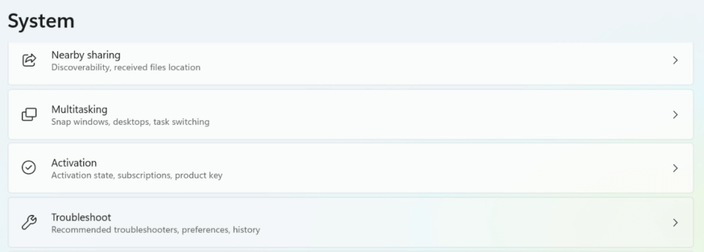 Paso 2:Haga clic en Sistema en el panel izquierdo de la ventana Configuración y luego haga clic en Solucionar problemas en el panel derecho.