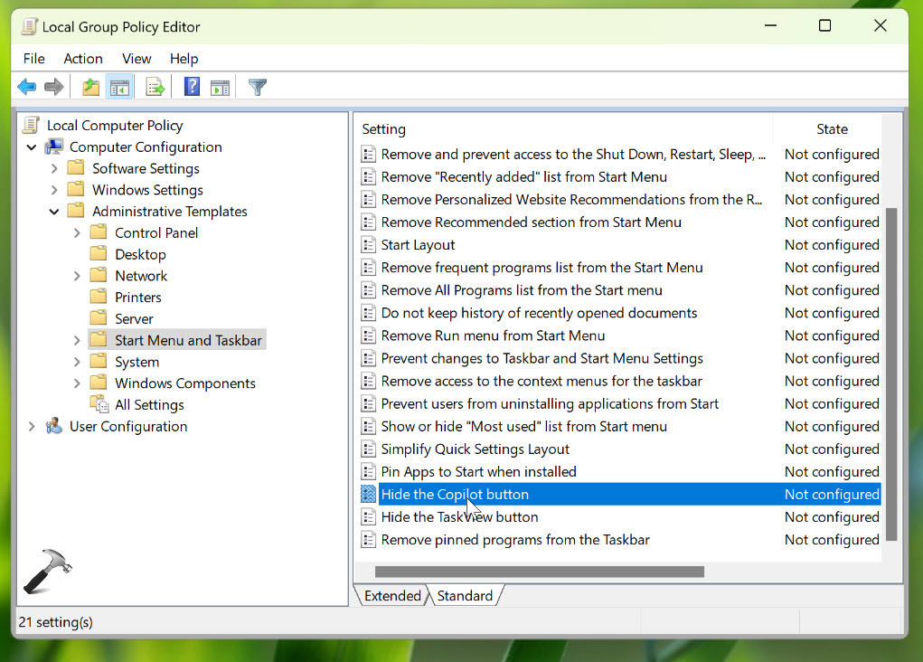 Localice la configuración de política denominada Ocultar el botón Copilot.