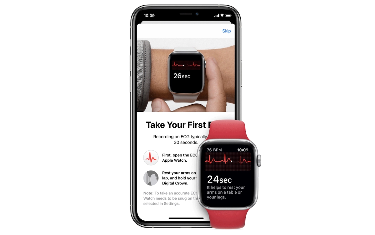 La aplicación ECG puede registrar los latidos y el ritmo del corazón de un usuario utilizando el sensor cardíaco eléctrico del Apple Watch Series 4, Series 5, Series 6 y Series 7 y luego verificar la grabación para detectar fibrilación auricular (AFib), una forma de ritmo irregular. La aplicación puede detectar Afib entre 50 y 150 BPM en la mayoría de los países.
