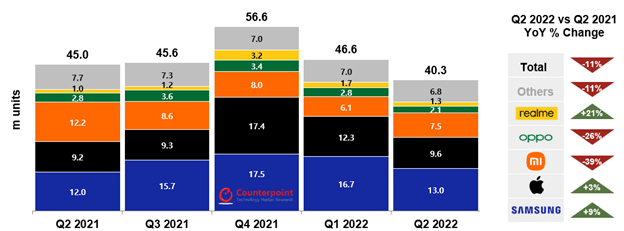 Xiaomi experimentó una caída año tras año debido a problemas de suministro. Sin embargo, logró aumentar los envíos en Europa del Este debido a la retirada rusa de Apple y Samsung. Oppo también estaba lidiando con problemas de la cadena de suministro, pero logró capturar un crecimiento de envíos año tras año de dos dígitos.