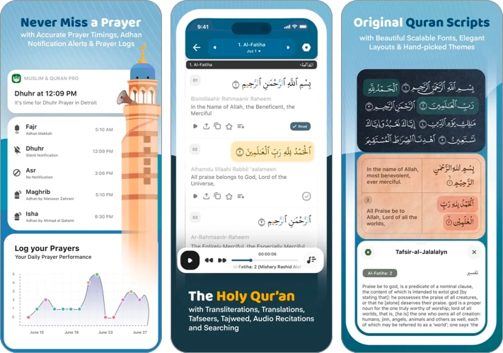 La aplicación Muslim & Quran es una de las aplicaciones más avanzadas para musulmanes que puede mostrarle tiempos de oración precisos según la ubicación. Recibes notificaciones de oración oportunas con hermosos Adhans. Puede leer o escuchar el Sagrado Corán en diferentes traducciones, transliteraciones y recitaciones de audio.