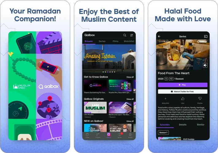Además, encontrarás Al Asman ul Husnah, guías de restaurantes halal y mezquitas a tu alrededor. En cuanto al centro de contenidos, verá una biblioteca de artículos e infografías sobre musulmanes, citas islámicas para tarjetas de felicitación y películas y documentales especialmente seleccionados.