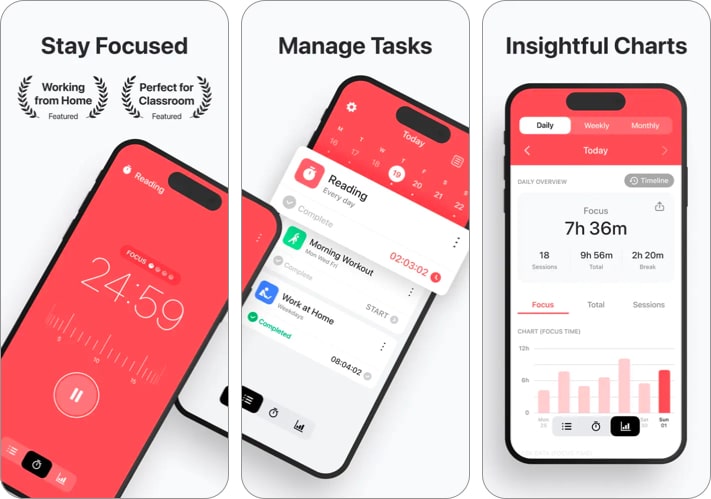 Puede crear tareas recurrentes o únicas y elegir la configuración de sonido por tarea para concentrarse, descansos y alarmas. También puede agregar notas a sus tareas pendientes a medida que el cronómetro cuenta atrás, ver su resumen o cronograma diario, semanal o mensual, y ver el tiempo total que dedica a sus tareas.