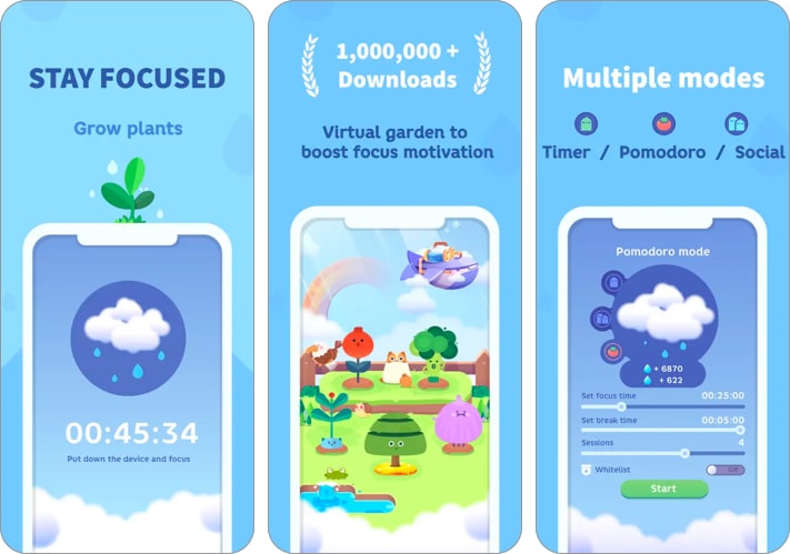 Si te gusta la idea de cultivar y nutrir la naturaleza mientras te concentras, Focus Plant: Pomodoro Timer es otra aplicación que debes probar. Este va un poco más allá con la gamificación. Crea un mundo colorido ganando gotas de lluvia mientras te concentras. Luego, riega tus verduras, planta otras nuevas y disfruta de una escena mágica después de haberte concentrado y haber cumplido tus tareas.
