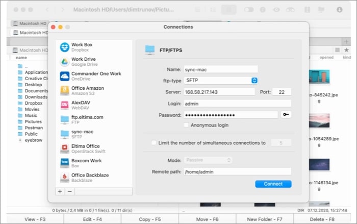 Commander One es principalmente adecuado para quienes trabajan con WebDAV, SFTP y más protocolos. Simplemente conecte la aplicación al servicio en la nube compatible y comience a mover, eliminar y organizar archivos. Además de eso, puedes disfrutar de una interfaz de doble panel en una pantalla grande para administrar archivos.