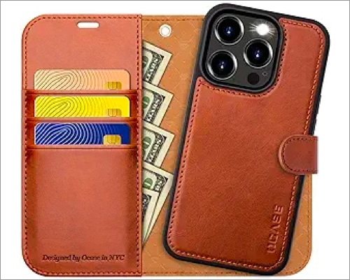 La funda de cuero OCASE es uno de los mejores accesorios para tu iPhone 15 Pro. Este estuche de piel sintética tiene una billetera con tapa magnética que le permite llevar sus tres identificaciones o tarjetas de crédito y dinero en efectivo. Por lo tanto, la billetera desmontable mantiene seguros sus elementos esenciales con su fuerte abrazadera magnética. ¡Conveniente!