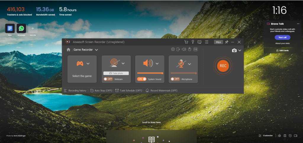 Para comenzar, simplemente necesita seleccionar lo que desea grabar y presionar el botónrecbotón. ¡Eso es todo! Una cosa que nos gustó de este grabador de pantalla es que te permitegrabar el audio del sistema y la cámara web individualmente.