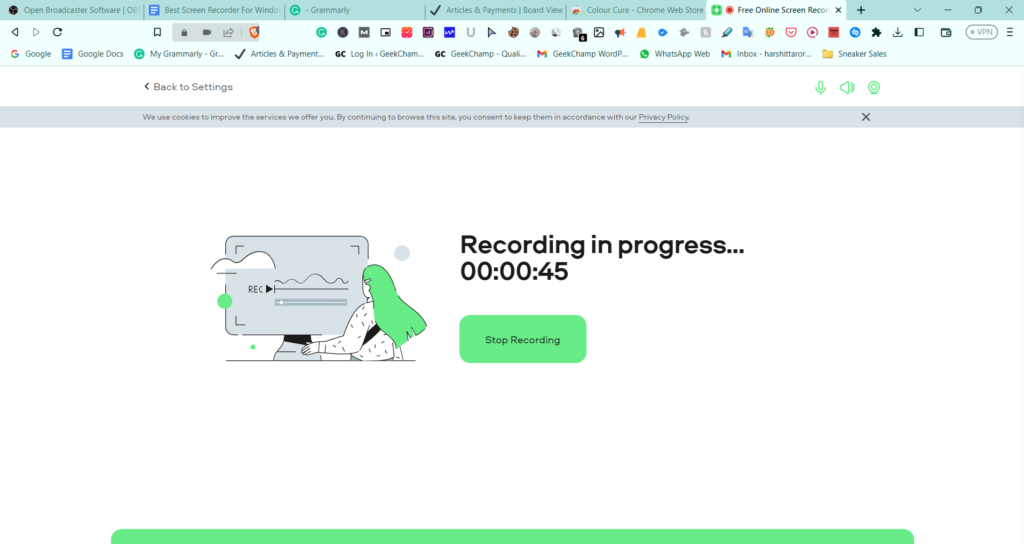 Aunque es un grabador de pantalla en línea gratuito; todavía te permiteincluye tu cara en la grabación de tu pantallaa través de su cámara web. No sólo esto, sino que también puede grabar vídeos con el sonido del sistema, incluido el micrófono. Ahora, pasando a sus limitaciones.