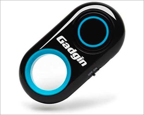 El Gadgin Premium Selfie Remote es un dispositivo compacto que se adapta al pulgar, casi más pequeño que la mayoría de los controles remotos para selfies que encontrarás. Su límite de distancia de Bluetooth es bastante impresionante, transmite a una frecuencia aproximada de 2,4835 GHz y cubre una distancia máxima de control del obturador de 10 metros.