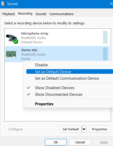 - Mantenga presionado o haga clic derecho en el dispositivo de grabación y luego elija elEstablecer como dispositivo predeterminadoopción
