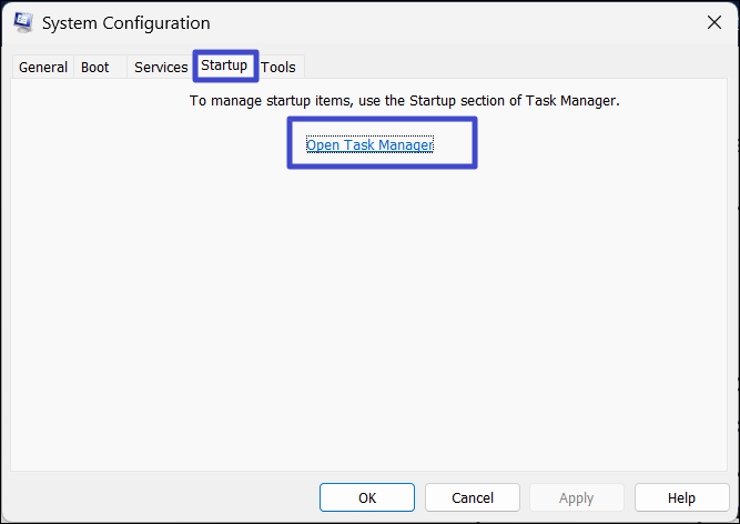 5. Cambie a "Puesta en marcha" pestaña y haga clic en "Abrir Administrador de tareas“.