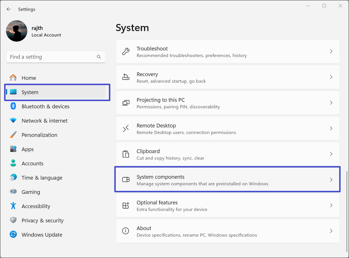 1. Abra la aplicación Configuración de Windows, vaya a "Sistema", y seleccione "Scomponentes del sistema" A la derecha.