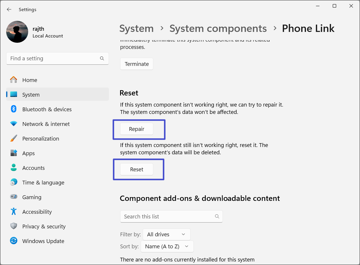 4. En la página siguiente, desplácese hacia abajo y haga clic en "Reparar". Si no funciona, también puede intentar restablecer el componente.