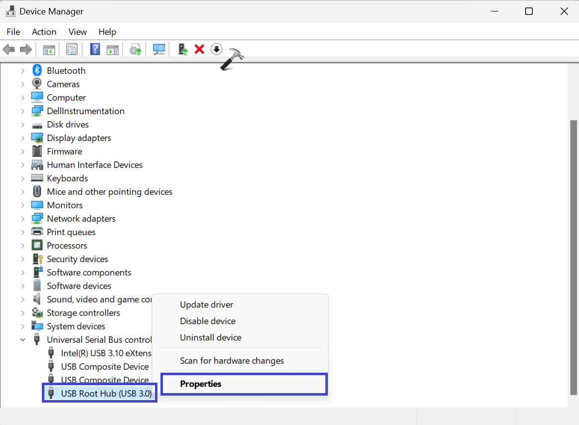 Haga clic derecho en cualquier concentrador raíz USB y haga clic en "Propiedades“.