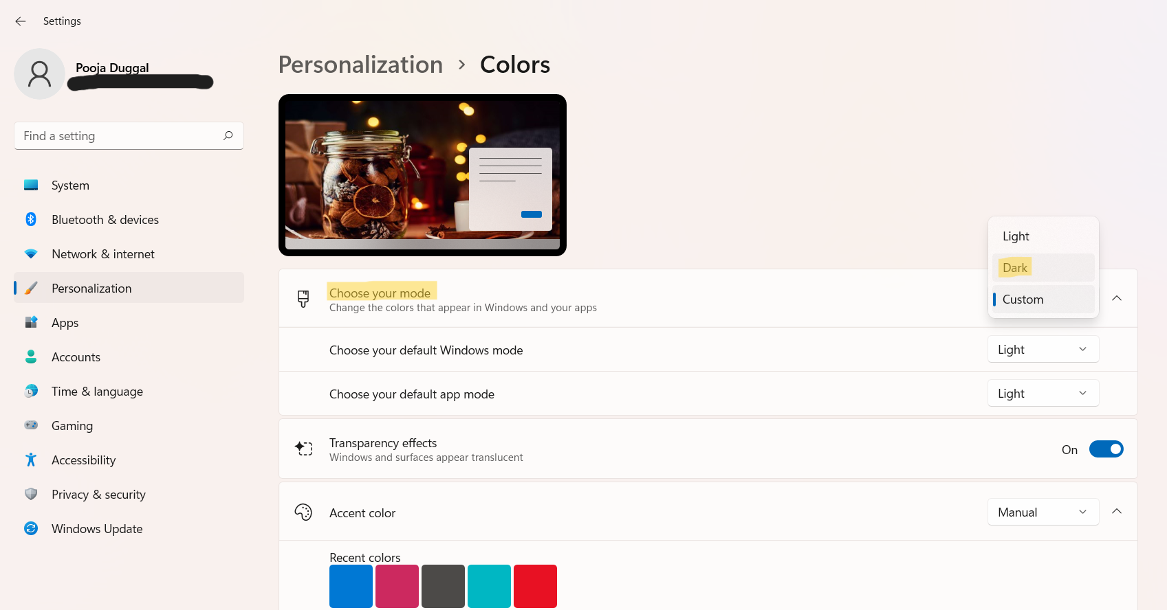 2.Una vez hecho esto, abra el menú desplegable presente al lado deElige tu modo. Ahora, elige elOscuroopción para aplicar el tema oscuro en Windows 11, incluido el Bloc de notas.