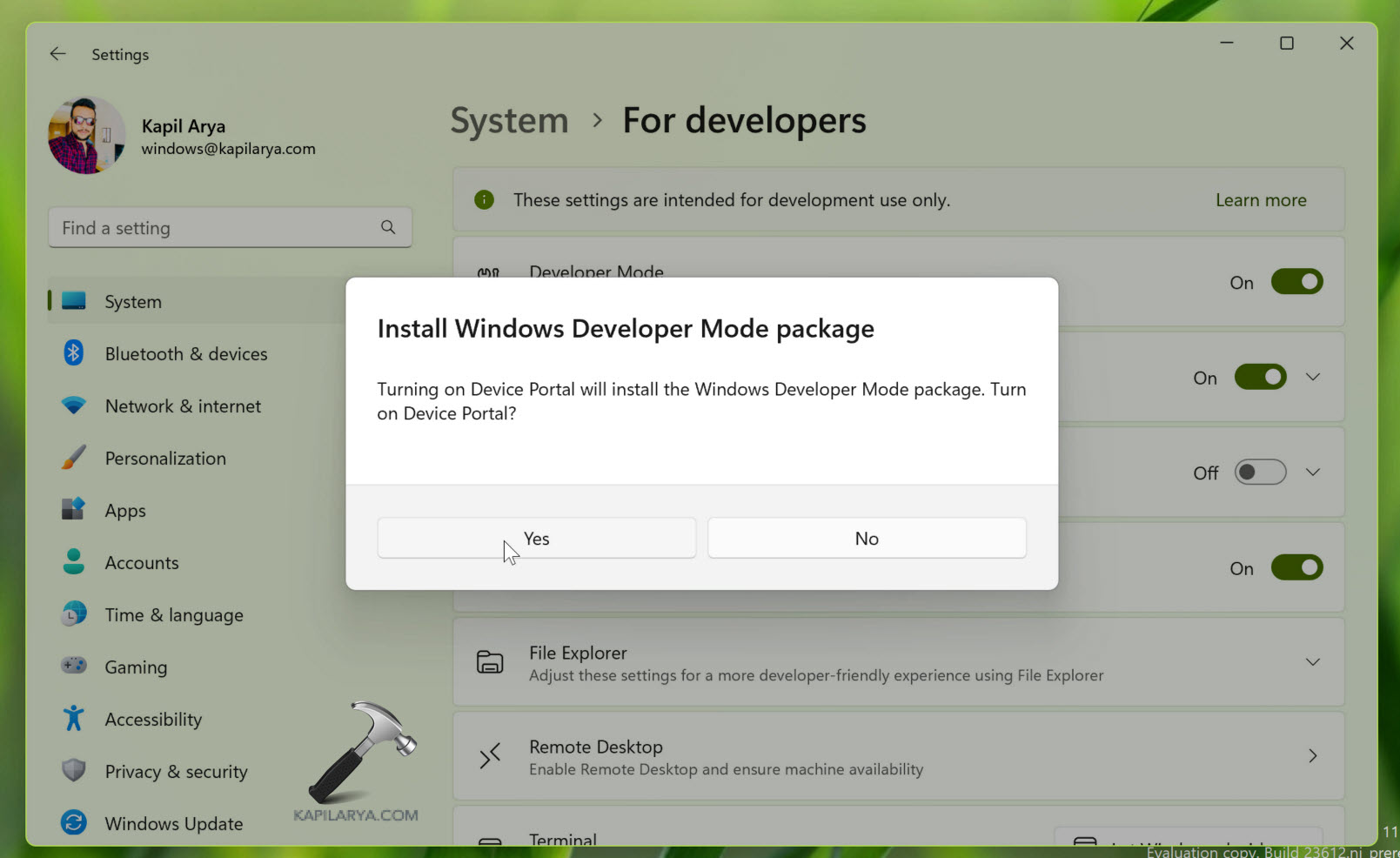 2. Es posible que aparezca un mensaje de confirmación pidiéndole que instale el paquete del Modo de desarrollador de Windows. Haga clic en Sí.