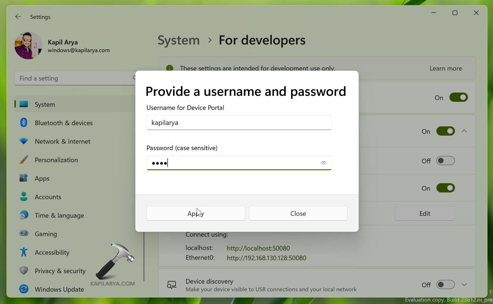 4. Una vez instalado el paquete del Modo de desarrollador de Windows, la opción Portal del dispositivo debe estar activada. Ahora puede acceder a él utilizando los enlaces mencionados en localhost y conexión Ethernet.