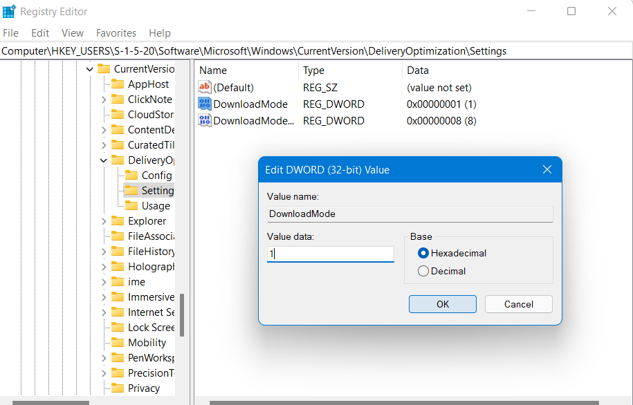 HKEY_USERSS-1-5-20SoftwareMicrosoftWindowsCurrentVersionDeliveryOptimizationSettings