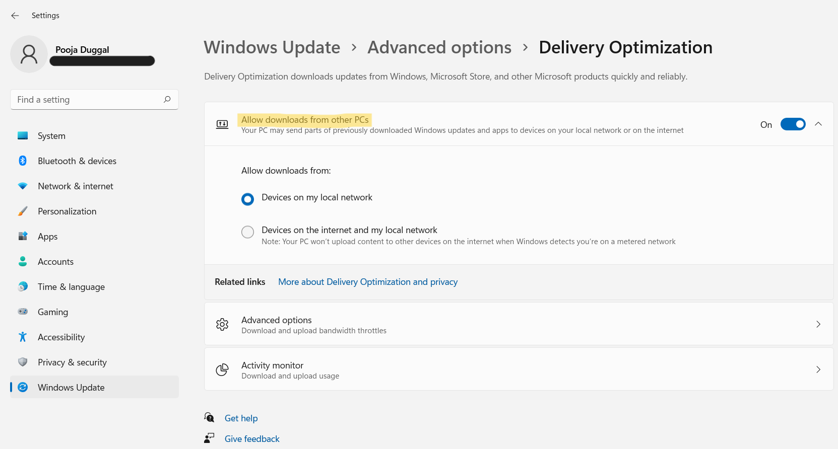 3.a) Para activar la optimización de entrega de Windows Update, activeEnel interruptor presente al ladoPermitir descargas desde otras PC. Luego, seleccioneDispositivos en mi red localoDispositivos en Internet y mi red localpara saber desde dónde desea permitir las descargas.