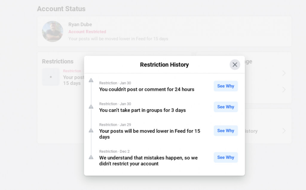 Si reincide en infringir las pautas comunitarias de Facebook, puede ver su historial de restricciones en esta misma área.
