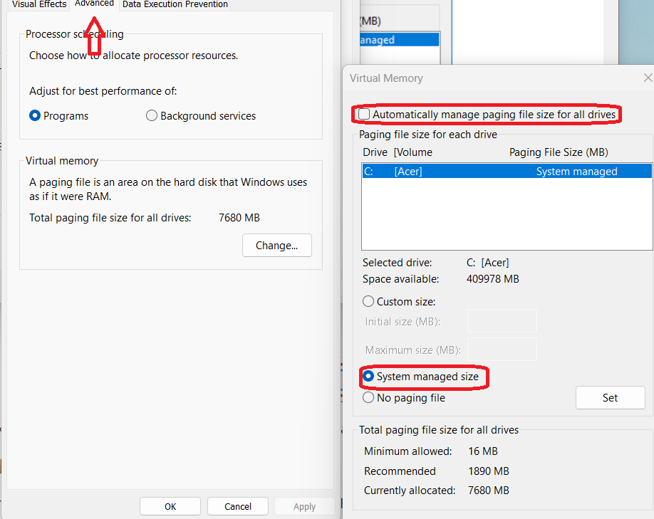 GrifoPestaña avanzada>Cambiar> desmarcarAdministre automáticamente el tamaño del archivo de paginación para todas las unidades>Tamaño administrado por el sistema>DE ACUERDO.