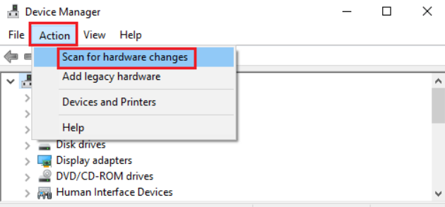 Hacer clic enComenzar>Administrador de dispositivos>Acción>Busque cambios de hardware.