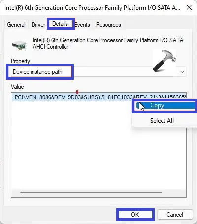 1. Vaya a la pestaña Detalles y cambie la propiedad a "Ruta de la instancia del dispositivo".