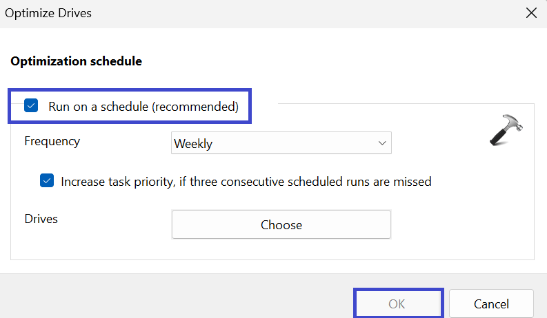 3. Ahora, desmarque "Ejecutar según un cronograma (recomendado)" y haga clic en Aceptar.