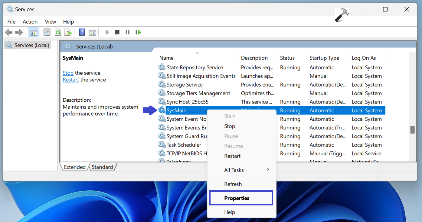 2. Haga doble clic en SysMain y seleccione Propiedades.