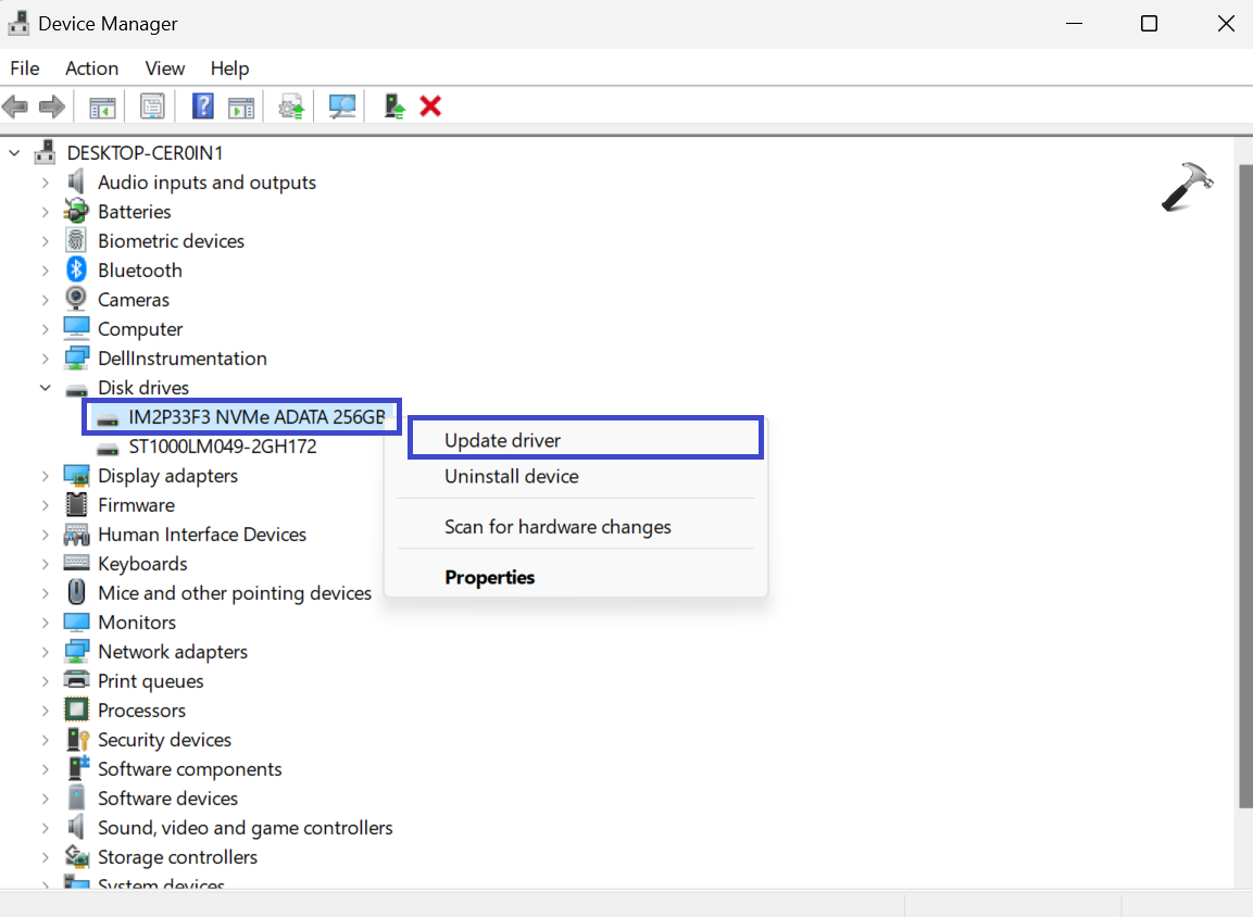 2. Ahora, expanda "Controladores de disco" y seleccione "Actualizar controlador".