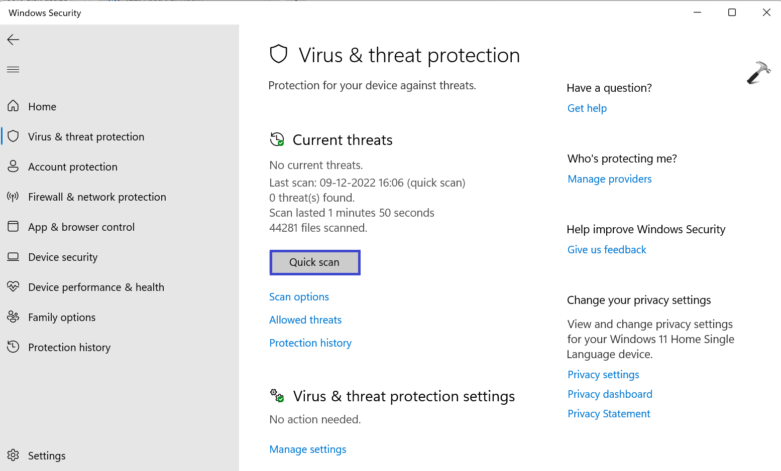 2. Haga clic en "Protección contra virus y amenazas" y haga clic en "Análisis rápido".