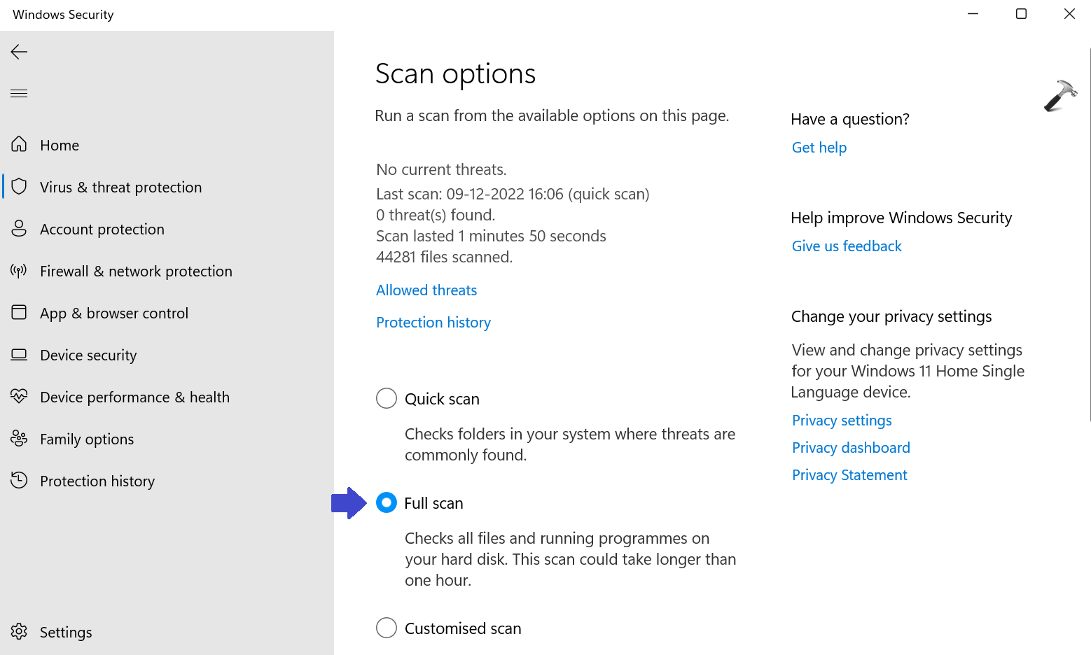 Luego, vaya a Protección contra virus y amenazas => Opciones de análisis => Análisis completo.