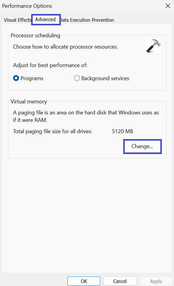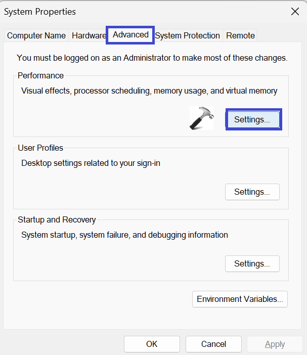 3. Ahora, en Opciones de rendimiento, vaya a la pestaña "Avanzado".