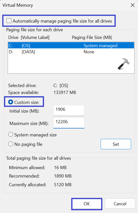 5. Aquí, desmarque "Administrar automáticamente el tamaño del archivo de paginación para todas las unidades" y seleccione "Tamaño personalizado".