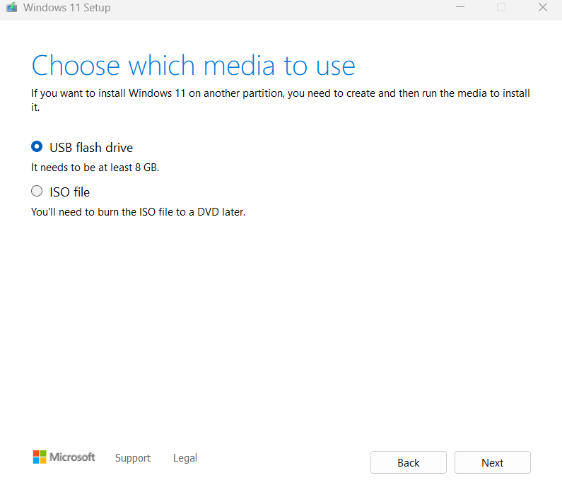 3. Elija el medio: unidad flash USB o archivo ISO > haga clic en Siguiente.
