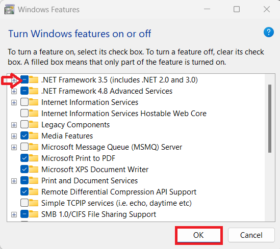 3. Desmarque .NET Framework 3.5 (incluye .NET 2.0 y 3.0) y haga clic en Aceptar.