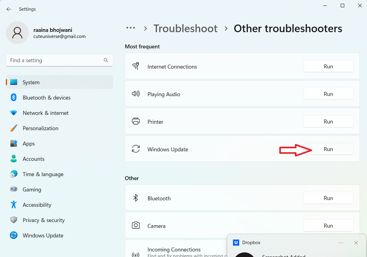 4. Haga clic en el botón Ejecutar junto a Windows Update.