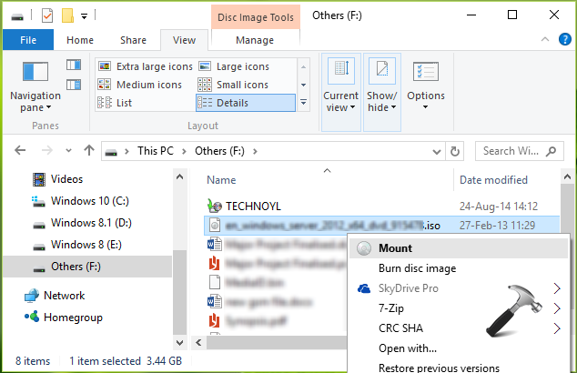1.Localice el archivo ISO del sistema operativo Windows usando el Explorador de archivos y haga clic derecho sobre él, seleccioneMontar. Esto montará la imagen del disco en su Windows con una letra de unidad temporal.