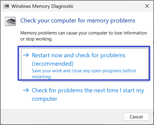 2. En la ventana Diagnóstico de memoria de Windows, seleccione "Reinicie ahora y verifique si hay problemas (recomendado)" opción.