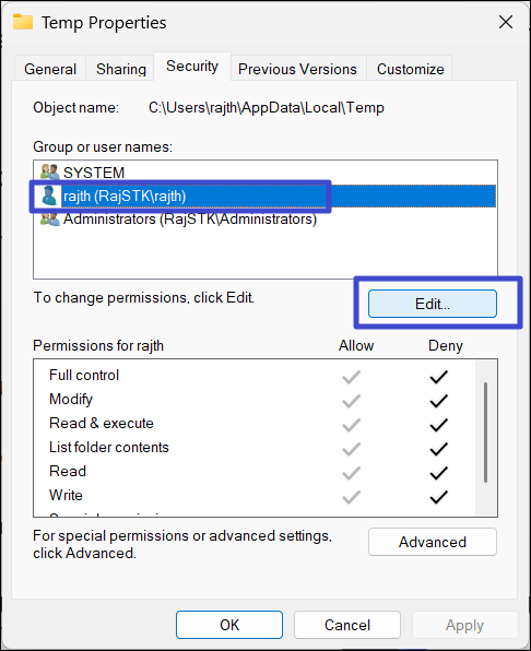 4. En la ventana Propiedades, vaya a "Seguridad", seleccione su nombre de usuario y haga clic en "Editar“.