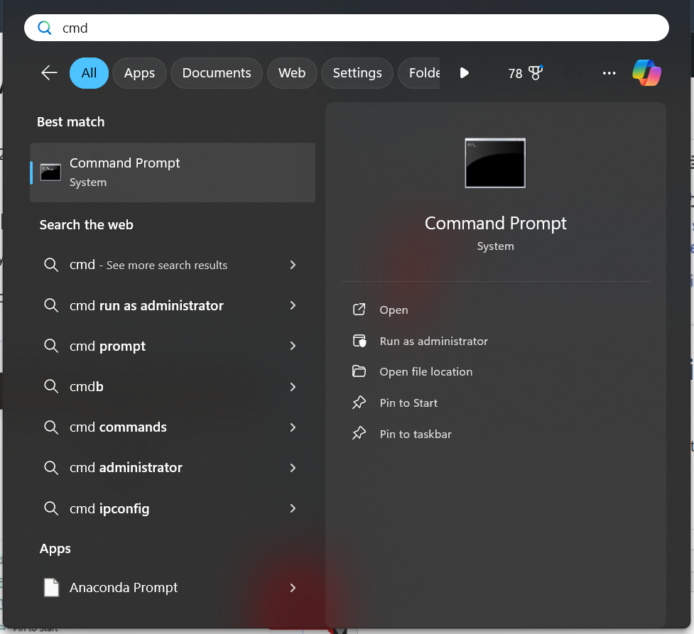 Paso 1:Abra el menú de inicio. Luego escribe “CMD”. Presione Entrar para continuar.