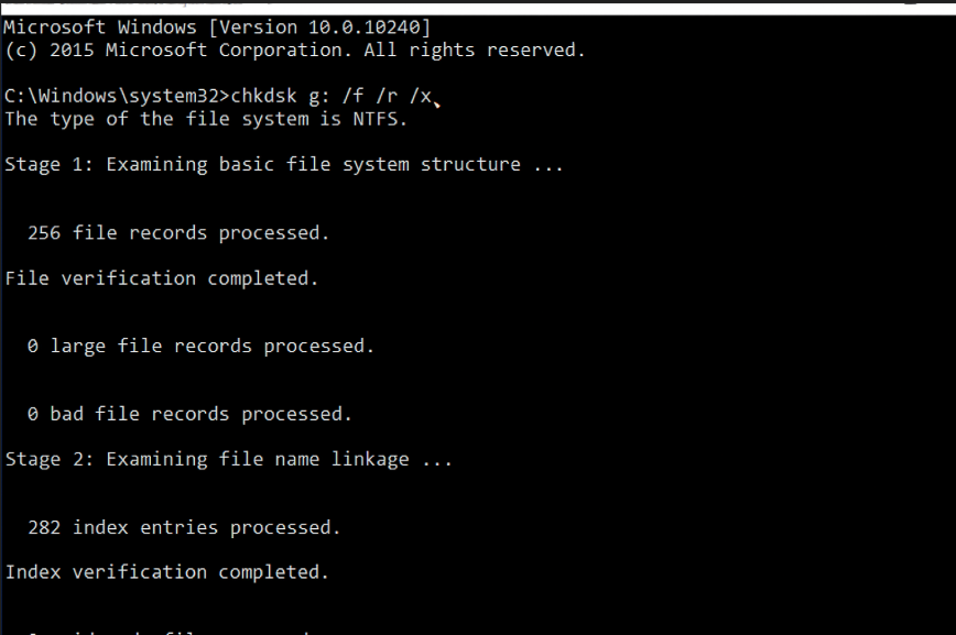 Paso 2:Tipochkdsk g: /f /r /xpara eliminar la protección contra escritura en el disco duro.