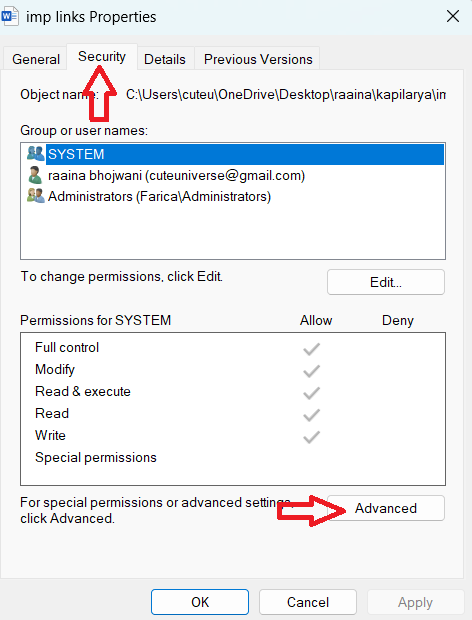 Luego, en la pestaña Seguridad, haga clic en el botón Avanzado.