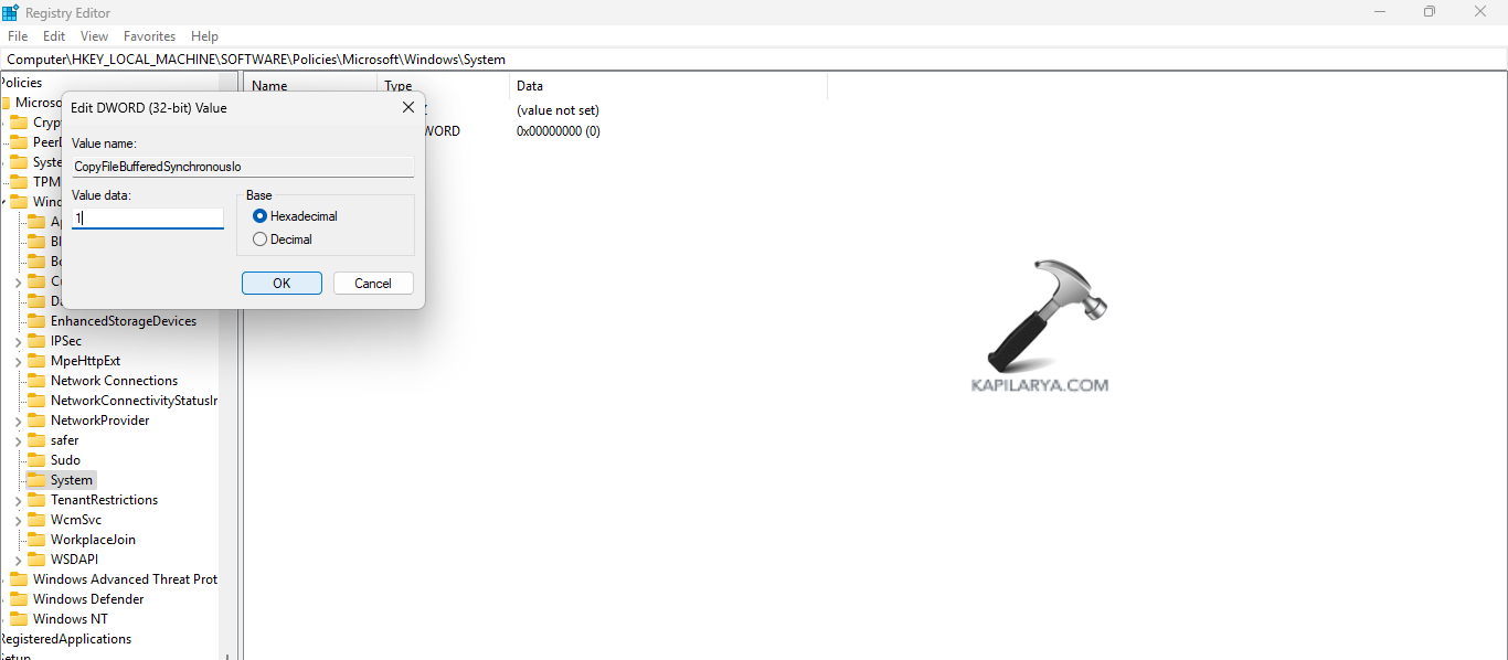 Paso 4-Además, cambie el nombre del valor aCopyFileBufferedSynchronousIoy haga clic en el botón Entrar.