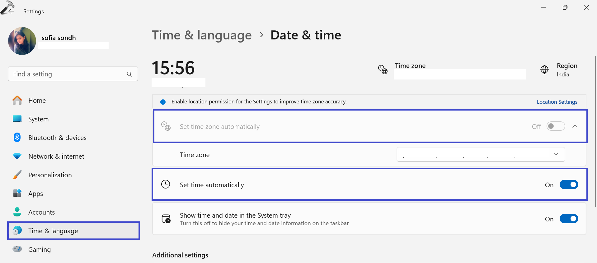 Además, habilite el botón "establecer zona horaria automáticamente" opción.