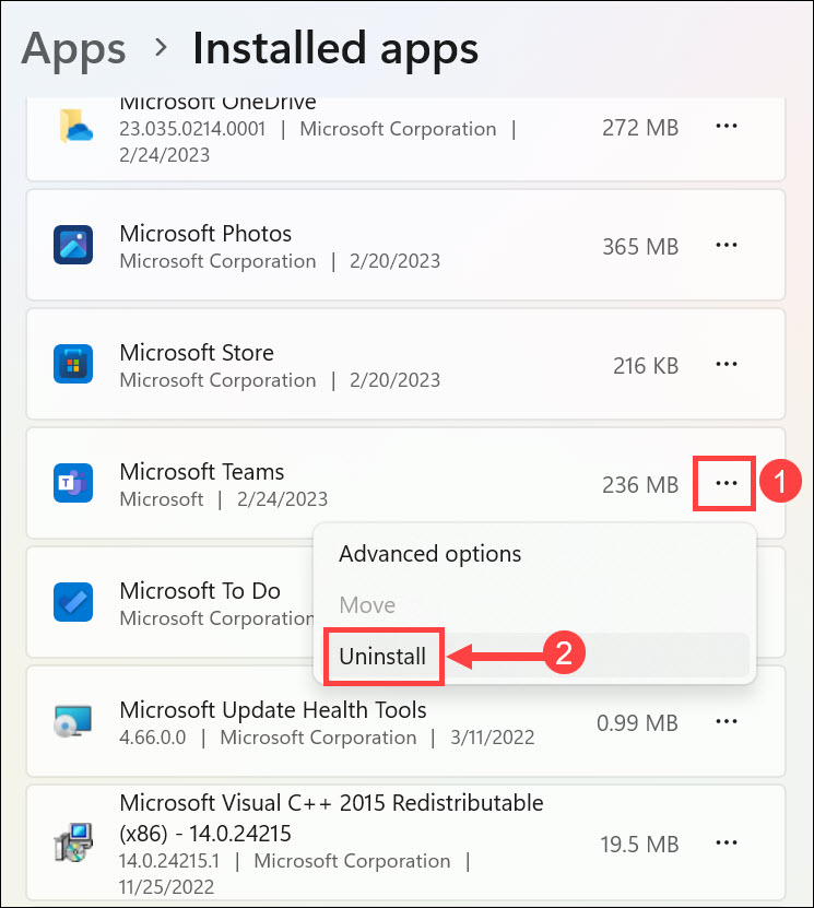3. Busque Microsoft Teams en la lista para modificar. Elija "Opciones avanzadas" en el icono de tres puntos.