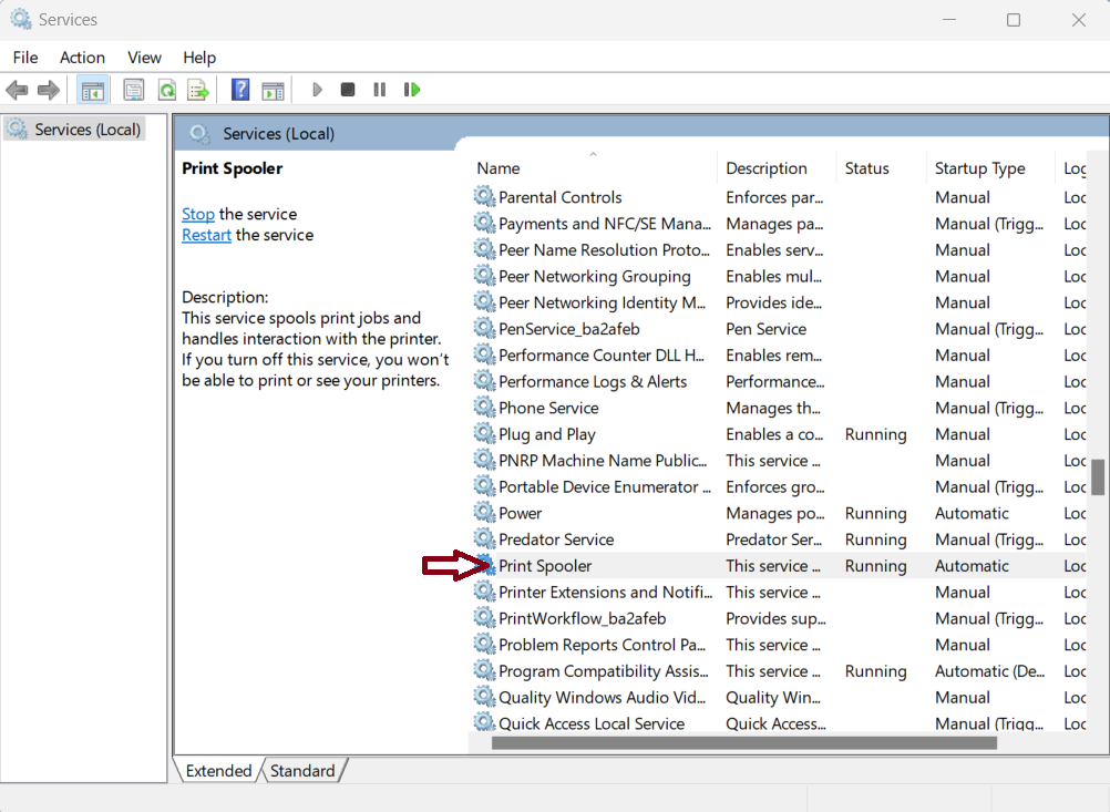 2. Haga clic derecho en Cola de impresión y elija Detener.